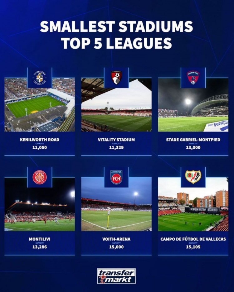 11月26日讯 德国转会市场盘点了目前欧洲五大联赛球场最小的球队,卢顿排名第一。