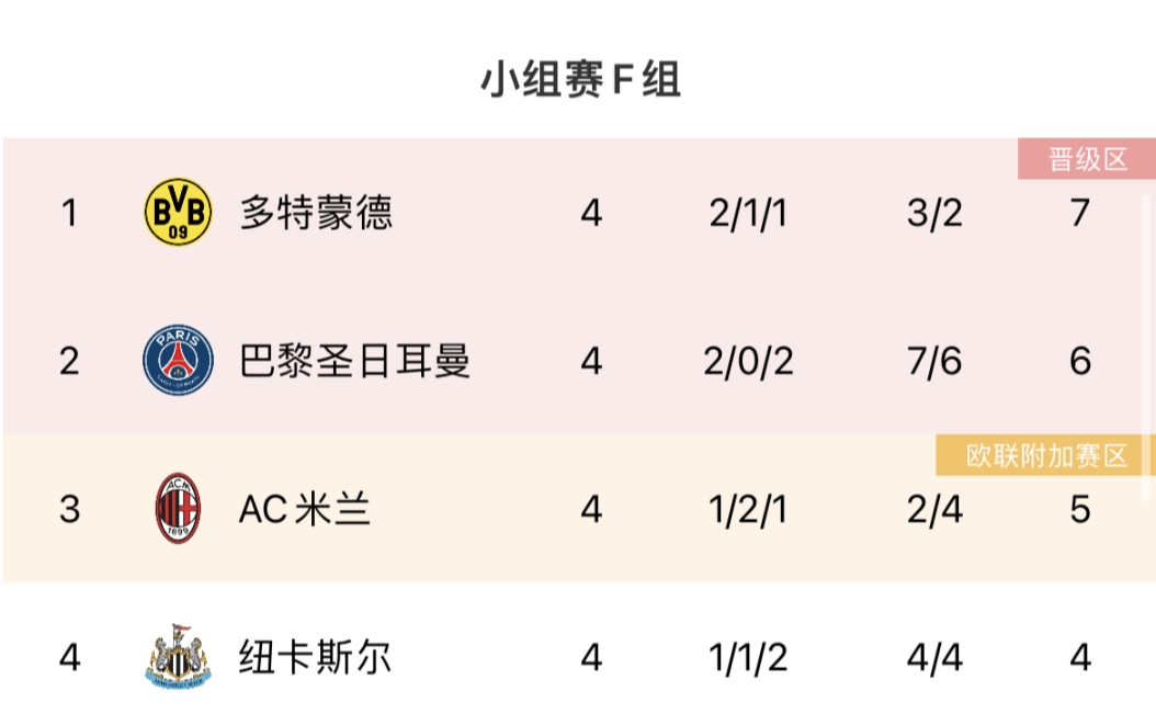 11月28日讯 欧冠F组第五轮几小时后就将打响,第四轮过后多特7分第一,巴黎6分第二,米兰5分第三,纽卡4分垫底。本轮米兰将战多特,巴黎战纽卡。赛前先来看看四队的出线形势。