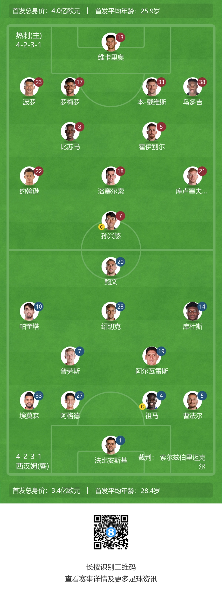 热刺首发:13-维卡里奥、23-波罗、17-罗梅罗、33-本戴维斯、38-乌多吉、8-比苏马、5-霍伊别尔、18-洛塞尔索、21-库卢塞夫斯基、22-约翰逊、7-孙兴慜