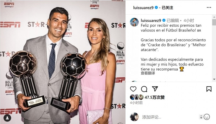 苏亚雷斯晒出与妻子的奖杯合照,并写道:“很高兴获得巴西足球界如此宝贵的奖项!感谢大家的认可。这些奖项特别献给我的妻子和孩子们。一分耕耘一分收获。”