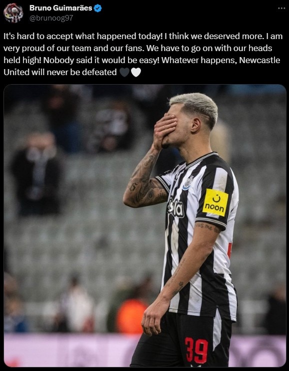 吉马良斯写道:“很难接受今天发生的一切!我认为我们应该得到更多。我为我们的球队和球迷感到骄傲,我们必须昂首挺胸地走下去!没有人说过这会很容易!无论发生什么,纽卡斯尔联队永远不会被打败。”