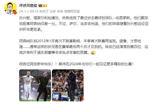 英超第20轮,阿森纳1-2不敌富勒姆近5轮仅1胜,热刺3-1伯恩茅斯距榜首3分。赛后,詹俊对比赛发表了看法。詹俊说:“孙兴慜、理察尔利松建功,热刺击败了最近状态最好的球队--伯恩茅斯