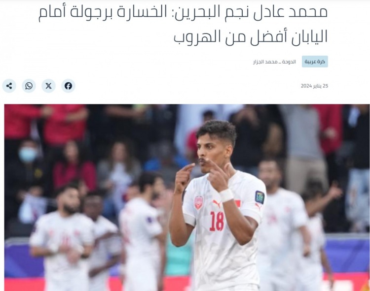 1月29日讯 亚洲杯小组赛末轮,巴林1-0战胜约旦E组头名出线,16强淘汰赛将面对夺冠热门日本。巴林后卫阿德尔接受alaraby采访时表示,哪怕是输球也比躲着日本好。阿德尔说:“我们很