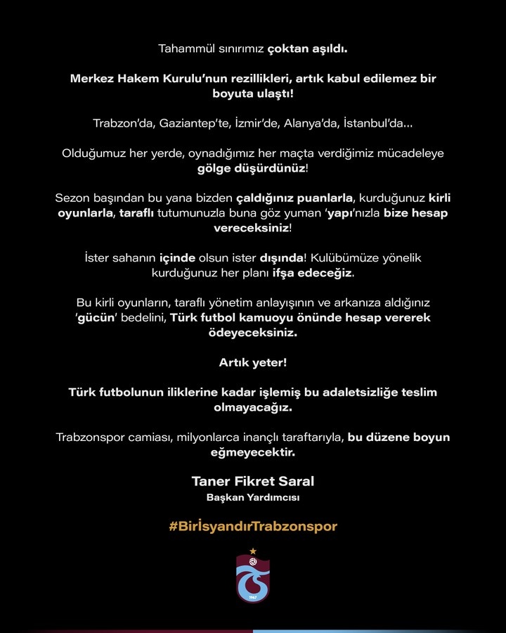 今天,特拉布宗再次发文怒喷裁判,他们写道:“我们的副主席塔纳尔-菲克雷特-萨拉尔的声明:我们的容忍度已经超过了极限,裁判委员会的暴行已经到了令人无法接受的地步!”