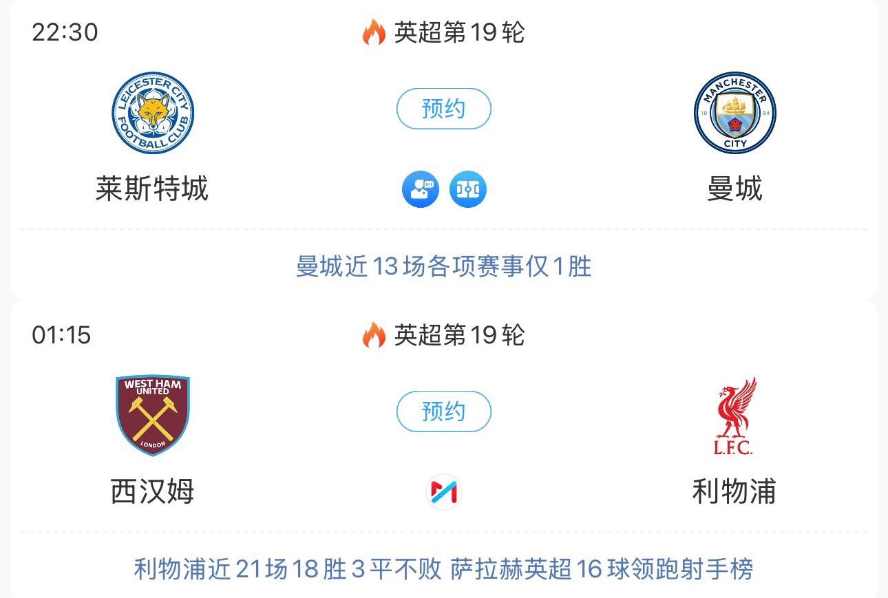 12月29日讯 英超第19轮今晚开打,22:30曼城客战莱斯特城,1:15利物浦客战西汉姆。
