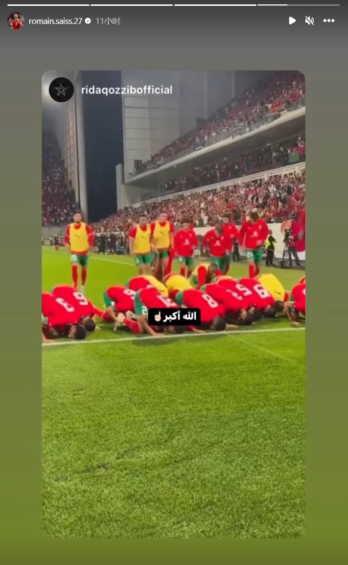 9月13日讯 摩洛哥后卫罗曼-塞斯今天在Instagram晒出视频,摩洛哥球员在球队进球后跪地祈祷。