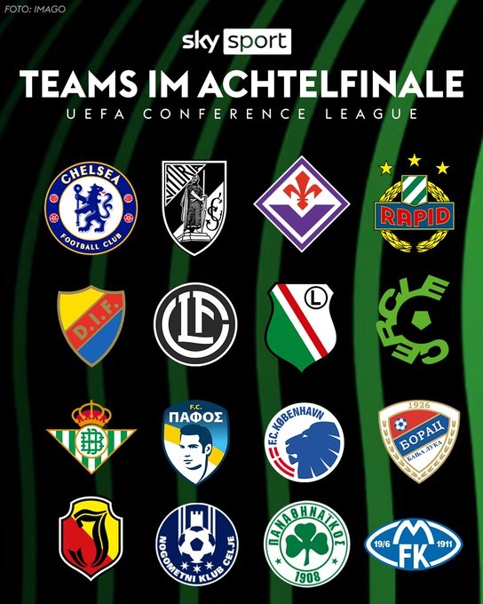 欧协联16强:切尔西、吉马良斯、佛罗伦萨、维也纳快速、尤尔加登、卢加诺、华沙莱吉亚、色格拉布鲁日、贝蒂斯、哥本哈根、帕福斯、巴尼亚卢卡战士、帕纳辛奈科斯、采列、乔治罗尼亚、莫尔德