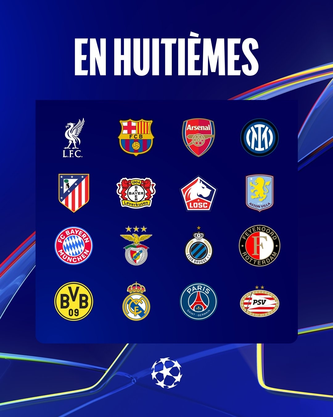 欧冠16强:利物浦、巴萨、阿森纳、国米、马竞、勒沃库森、里尔、维拉、本菲卡、拜仁、费耶诺德、布鲁日、多特、巴黎、皇马、埃因霍温