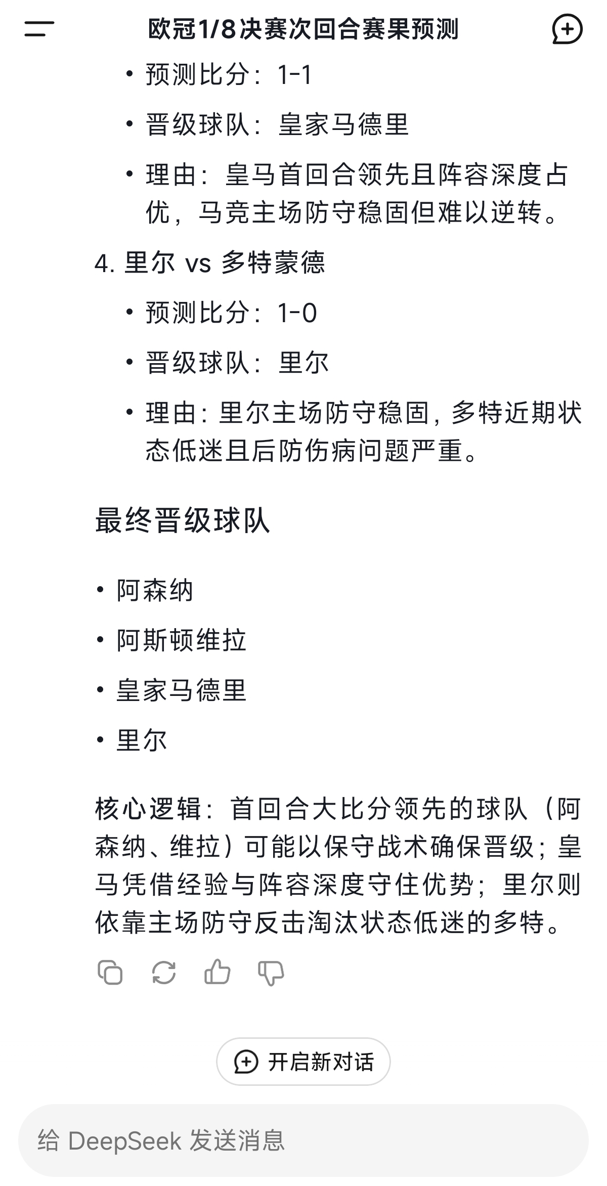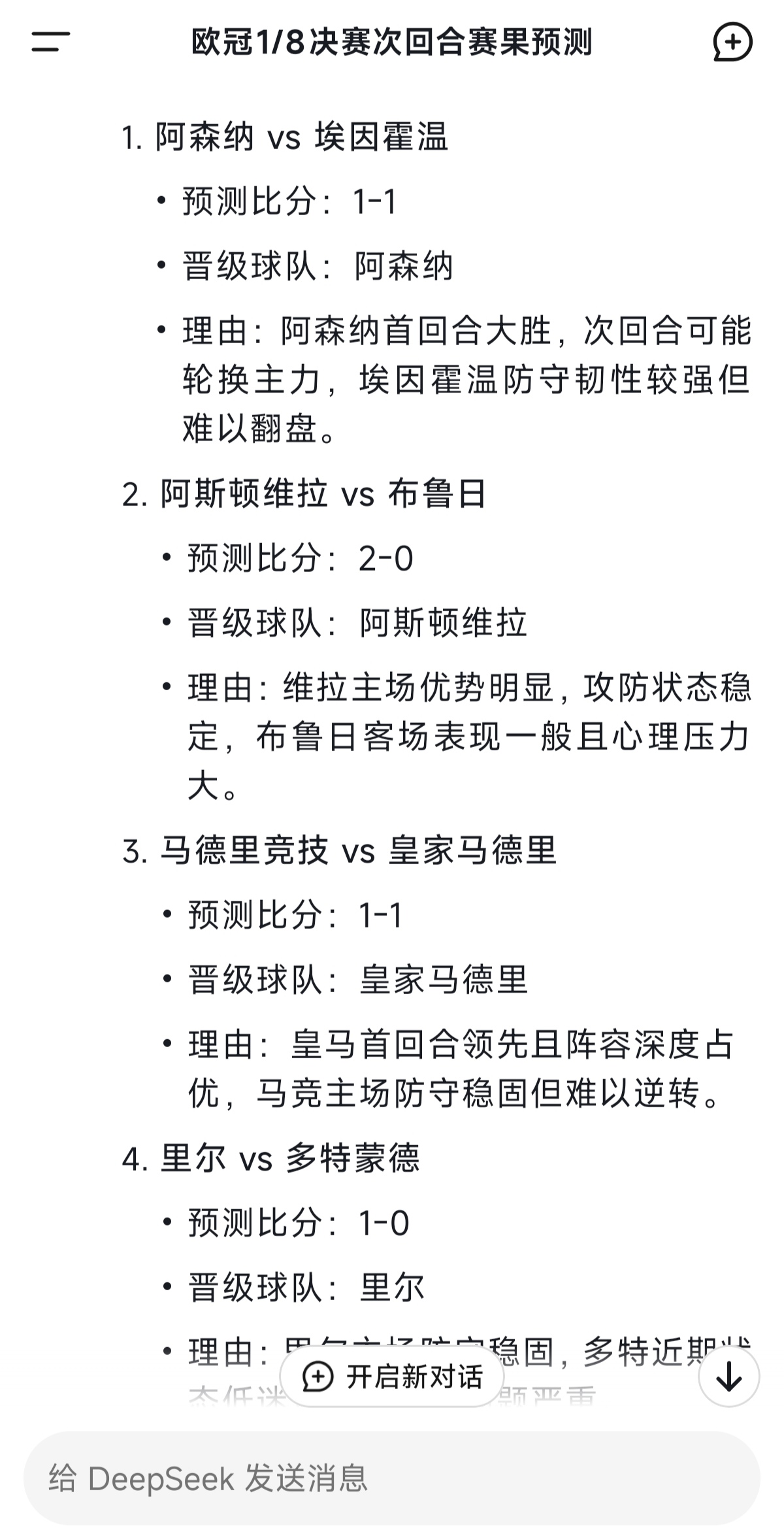 DeepSeek预测明晨欧冠:皇马11马竞阿森纳11PSV多特出局