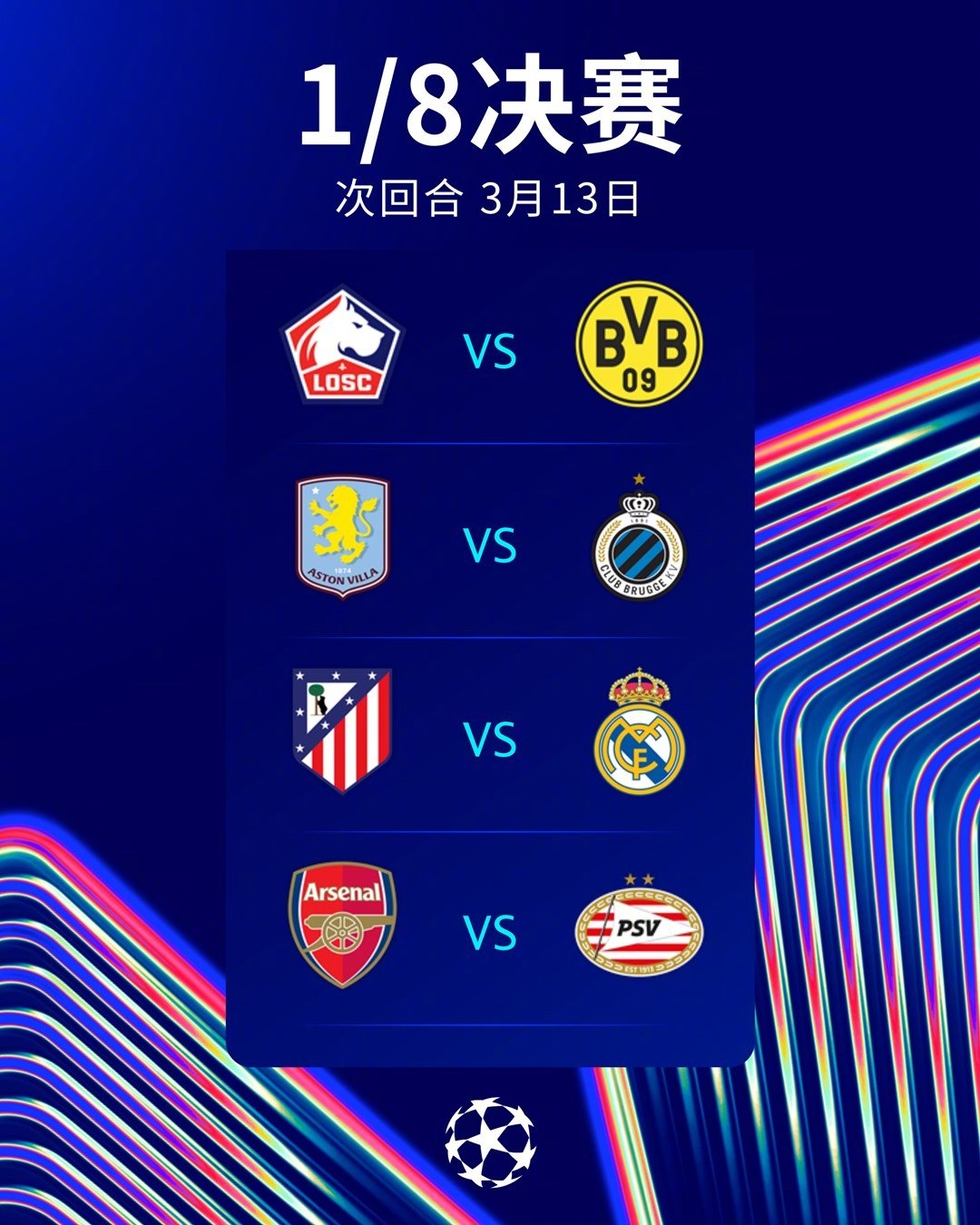 DeepSeek预测3月13日凌晨欧冠比分:阿森纳1-1埃因霍温(总比分阿森纳8-2晋级)阿斯顿维拉2-0布鲁日(总比分维拉5-1晋级)马德里竞技1-1皇家马德里(总比分皇马3-2晋级)里尔1-0多特蒙德(总