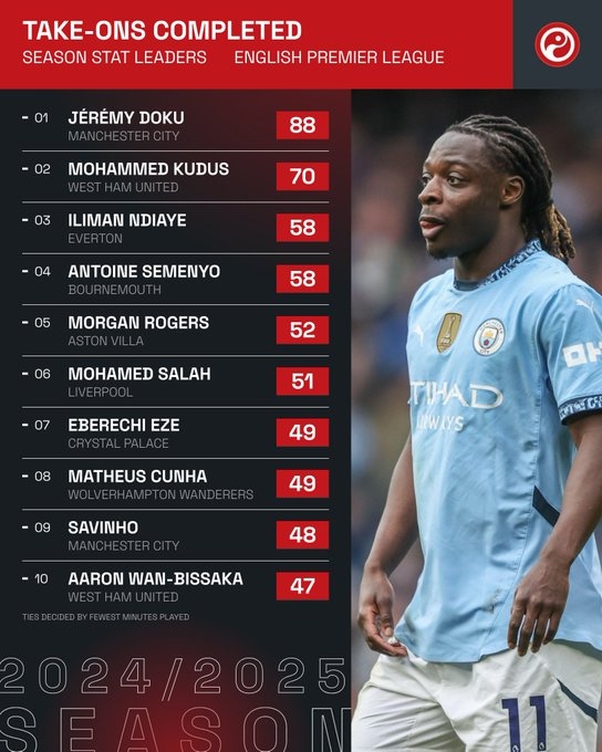 本赛季英超成功过人榜: