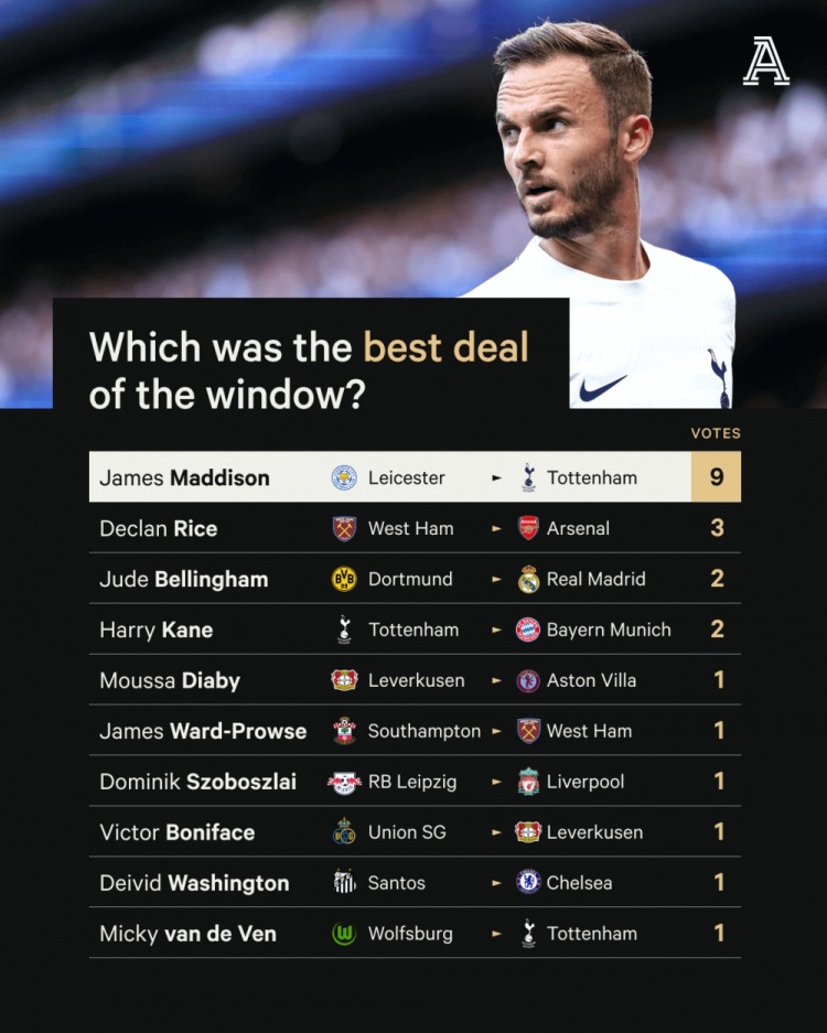 9月14日讯 近日,The Athletic采访了一些参与到英超夏窗转会的经纪人,让他们投票选出了自己认为的夏窗转会中的最佳、最差引援。夏窗最佳引援投票1、麦迪逊(莱斯特城→热刺),9票2