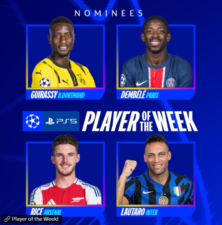 欧冠官方本轮最佳球员候选:吉拉西、登贝莱、赖斯、劳塔罗