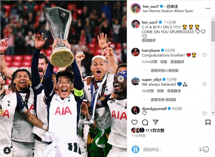 这是孙兴慜热刺生涯首冠,孙兴慜赛后在社交媒体上晒出捧杯照片,配文:“冠军!加油热刺!”