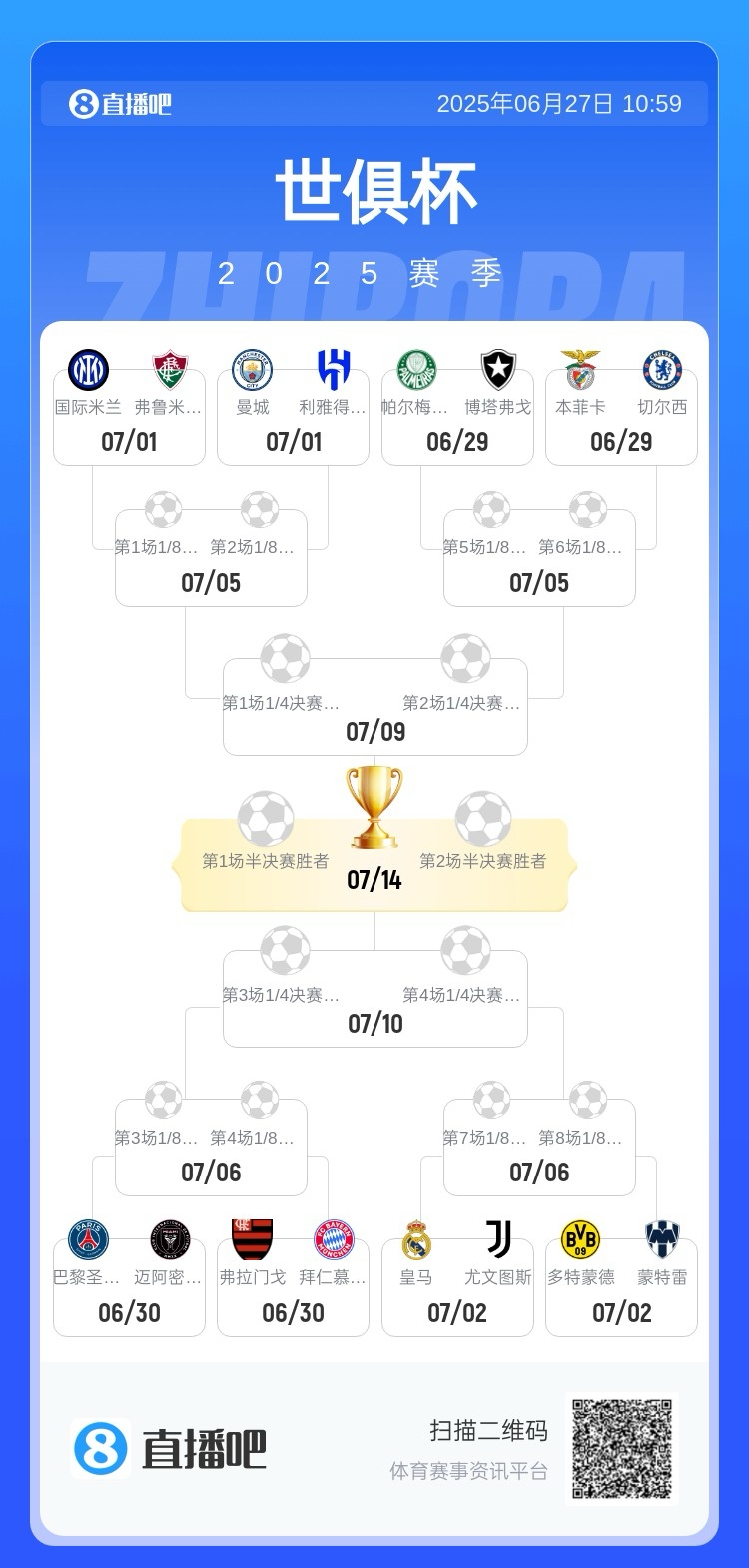 06月27日讯 世俱杯小组赛战罢,16强球队及其对阵出炉,国米、曼城、切尔西同半区,巴黎、迈阿密国际、拜仁、皇马、尤文、多特同半区。上下半区谁能突围,最终会师决赛?