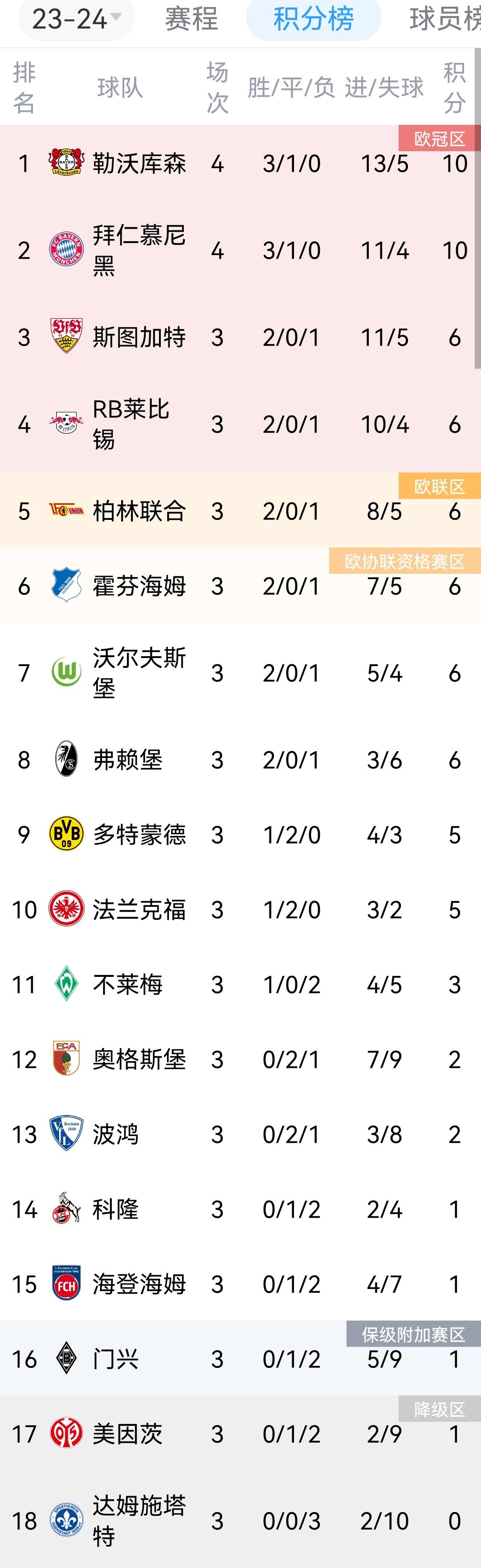 德甲积分榜:拜仁三连胜遭终结排第二,药厂净胜球优势领跑