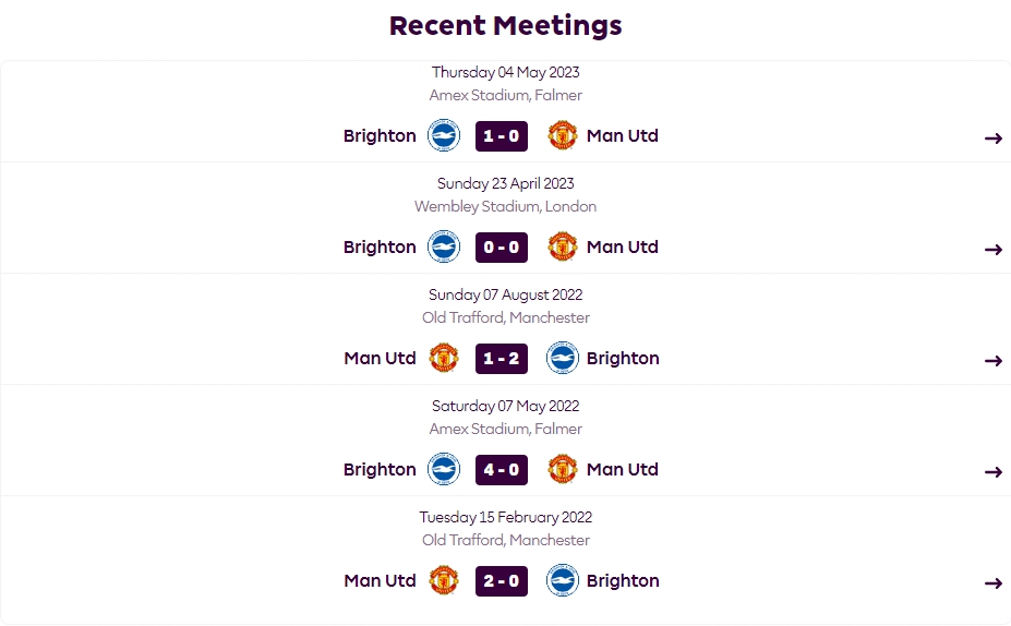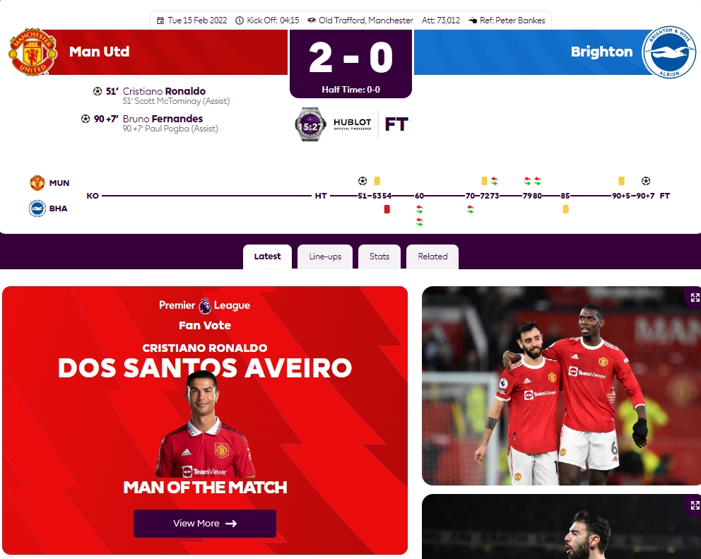 曼联上一次战胜布莱顿是在2022年2月,当时C罗和B费分别破门,帮助曼联在主场2-0战胜海鸥。