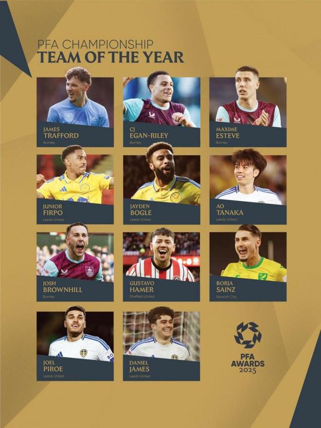 8月20日讯 昨日进行了PFA年度颁奖典礼,典礼现场公布了由球员票选的2024/25赛季英冠联赛最佳十一人阵,现效力于利兹联的日本中场田中碧在列。