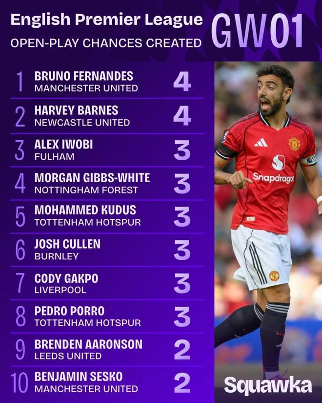 Squawka:在英超第一周的比赛中,B费在运动战中创造4次机会,和纽卡斯尔的巴恩斯并列第1。