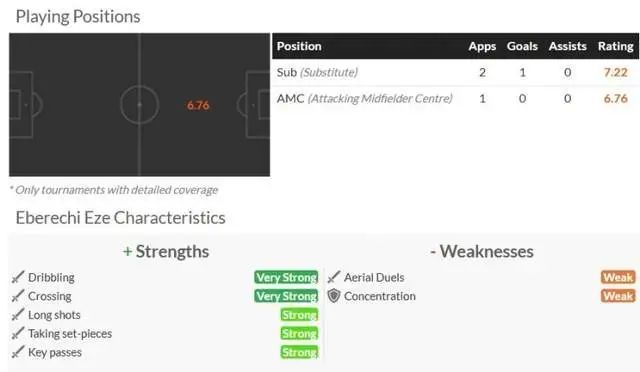 特别是赛季末,埃泽状态迎来了大爆发,自2-2战平阿森纳射入1球起,他在6场比赛中完成了7个进球,整体发挥很是出色,是水晶宫能够将排名迅速向上提升的关键功臣。