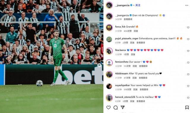 9月19日讯 巴萨在昨晚的欧冠焦点战客场2-1力克纽卡斯尔,新援门将霍安-加西亚表现出色,贡献5次扑救。 他也在赛后晒出自己的比赛照,并纪念自己的欧冠首秀:“伟大的欧冠之夜!”独