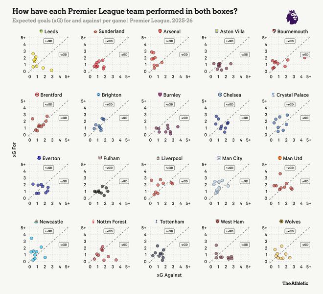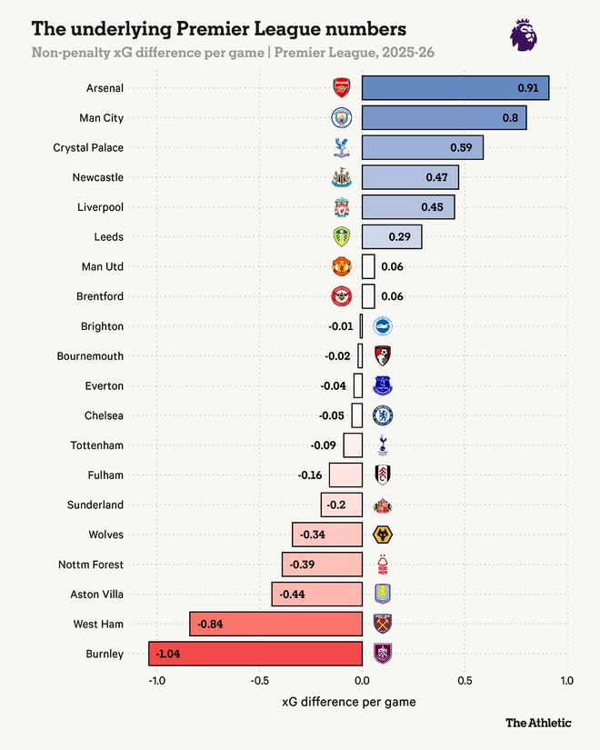 只有阿森纳和纽卡斯尔将对手的非点球预期进球(npxG)限制得比利兹联更低。在进攻端,利兹联的npxG排名第11位。遗憾的是,他们在两个禁区内的表现都不尽如人意。如果他们的表现回归平均水平,他们将飞速上升。