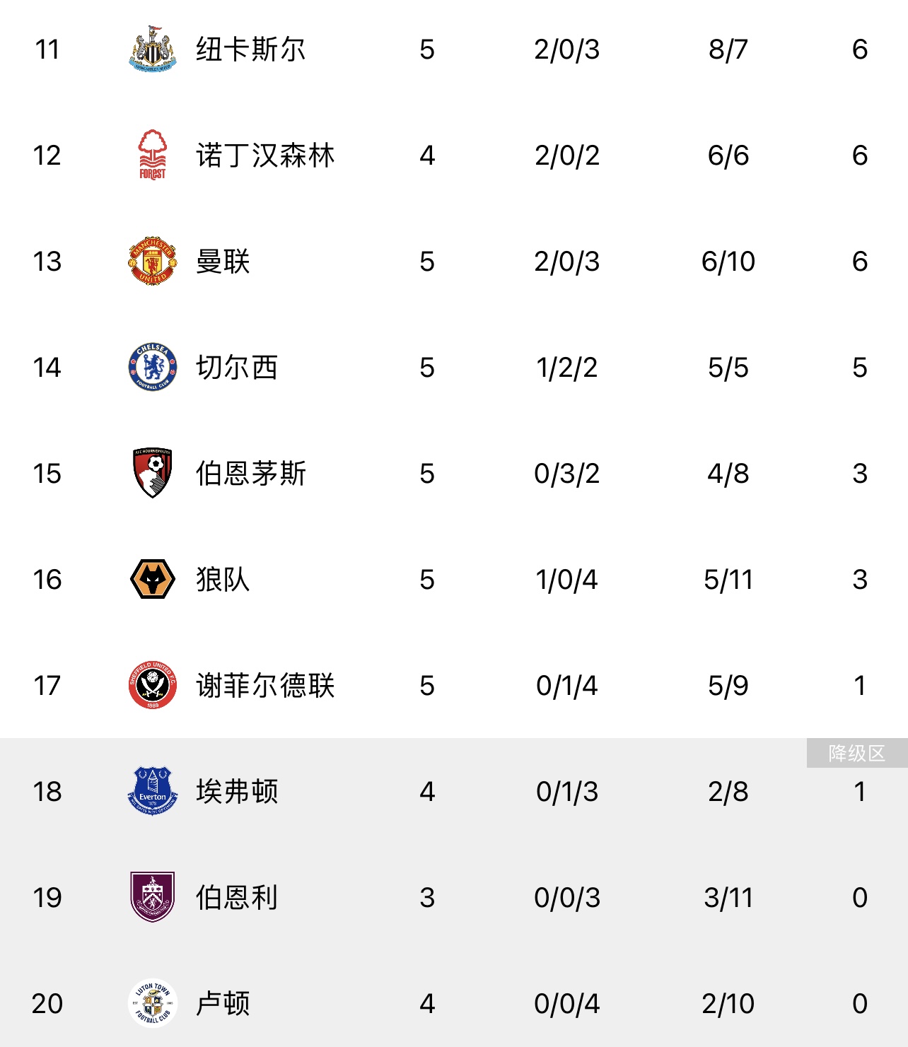 下半区竞争白热化!英超积分榜:曼联第13切尔西第14伯恩茅斯第15