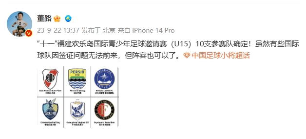董路:“十一”福建欢乐岛国际青少年足球邀请赛(U15)10支参赛队确定!虽然有些国际球队因签证问题无法前来,但阵容也可以了。