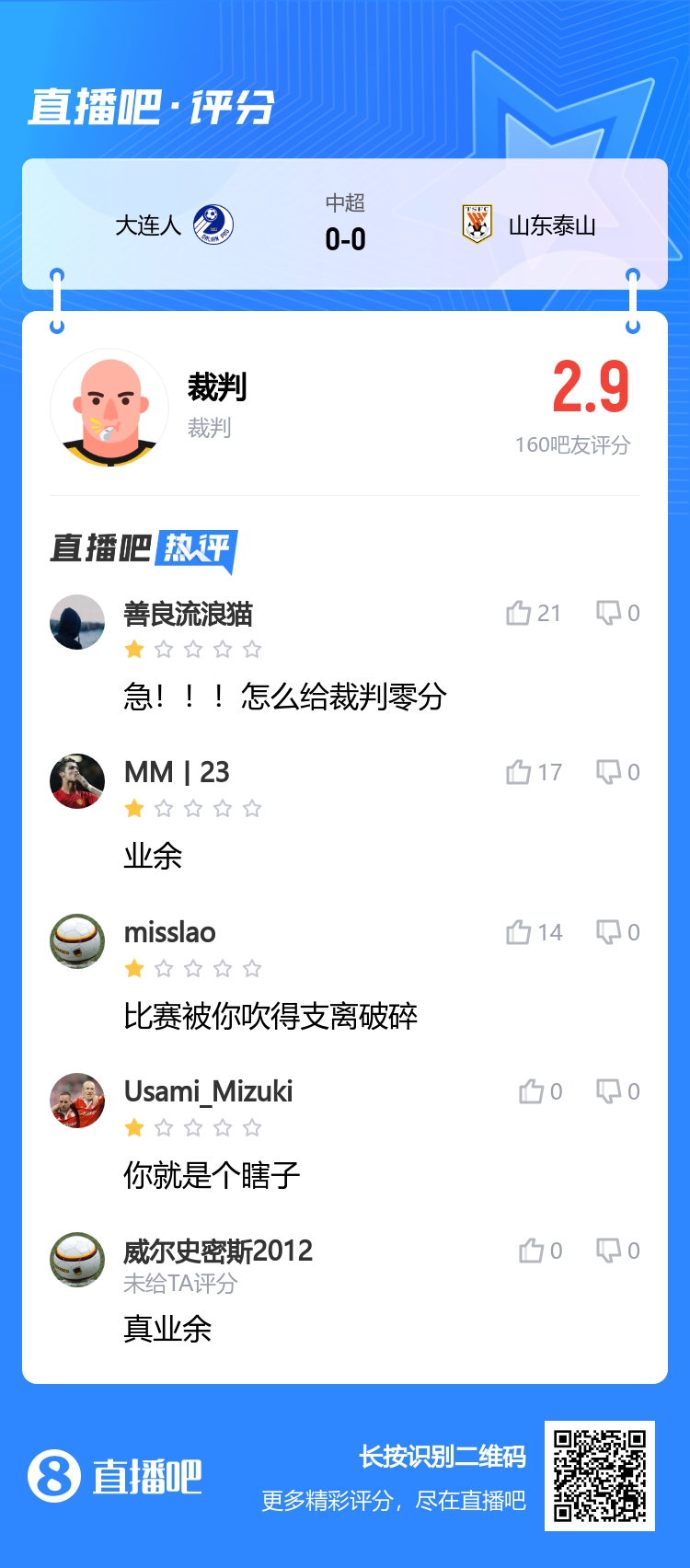 裁判抢戏吧友评大连人vs泰山裁判:怎么给0分&比赛吹得支离破碎