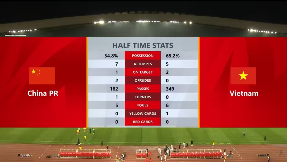 10月10日讯 国足半场0-0越南,半场控球率国足34.8%。