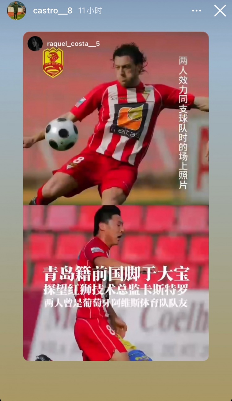 卡斯特罗在社媒晒出他俩的合影并配文介绍写道:“在葡萄牙时我们是队友,17年后我们以教练身份在中国相聚。”