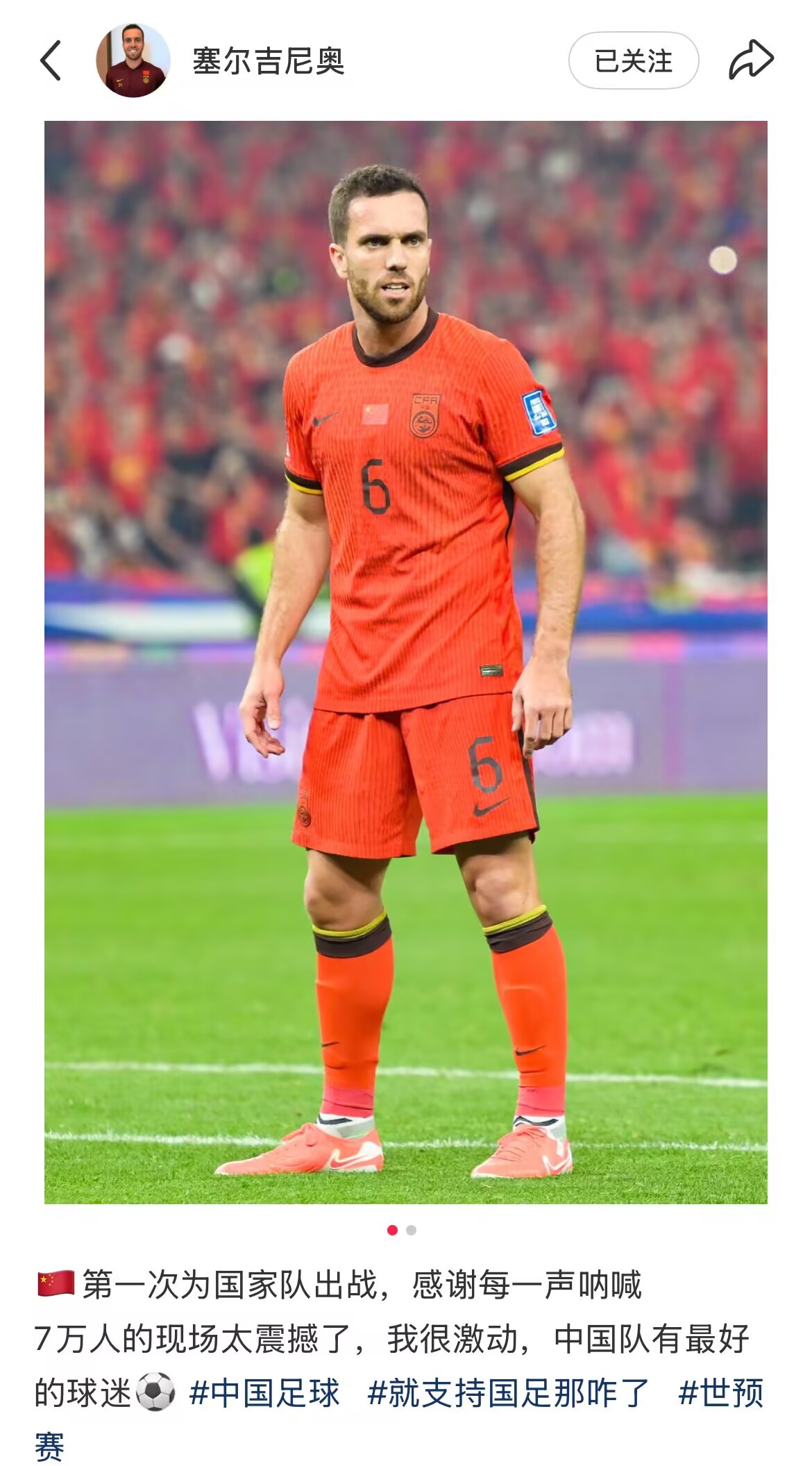 塞尔吉尼奥:“第一次为国家队出战,感谢每一声呐喊。7万人的现场太震撼了,我很激动,中国队有最好的球迷。”