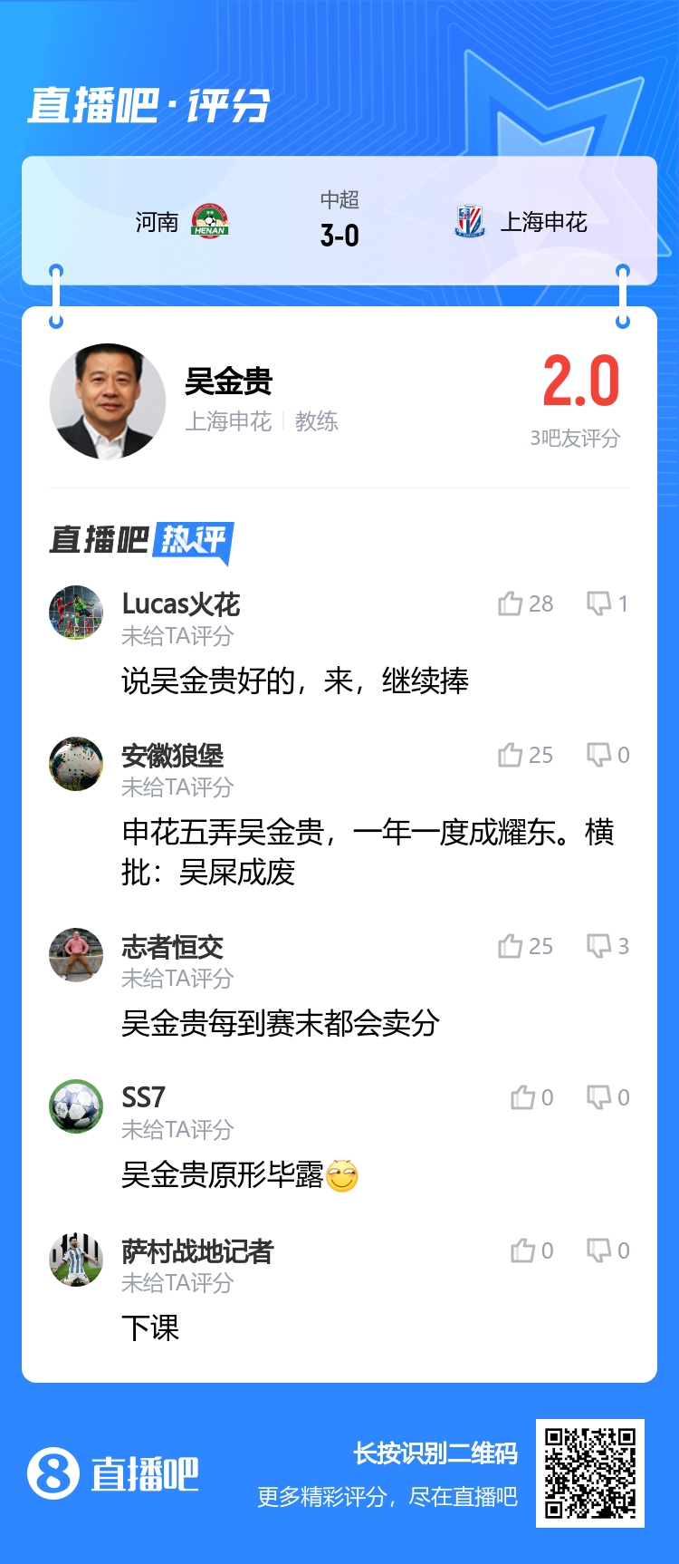 中超第25轮,上海申花客场0-3不敌河南。来看看吧友的神评论~