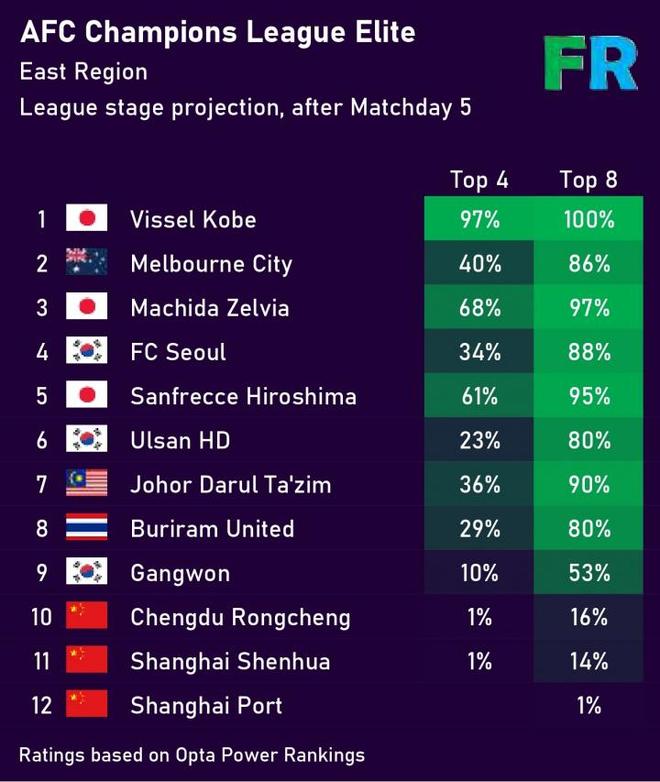 亚冠精英赛第5轮结束,大概的晋级名额已经大差不差。数据机构Footy Rankings公布了东亚区各队晋级概率排名,中超仨再度沦为难兄难弟,集体排名倒数前三。尤其是中超三连冠夺主上