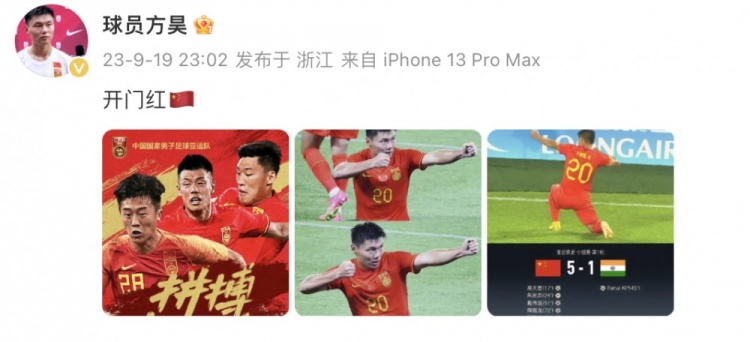 9月19日讯 帮助中国男足亚运队5-1战胜印度后,方昊更新社媒庆祝了这场胜利。